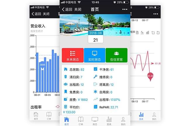掌上通為您提供樹狀圖,走勢圖實時對比,提供周對比,月對比,宏觀掌握每家酒店的營業(yè)收入統(tǒng)計、出租率情況;生成圖形占比,分別查看上門散客、協(xié)議單位、旅游團隊、美團預(yù)付、內(nèi)部用房、飛豬、攜程預(yù)付、同程預(yù)付房租組成情況